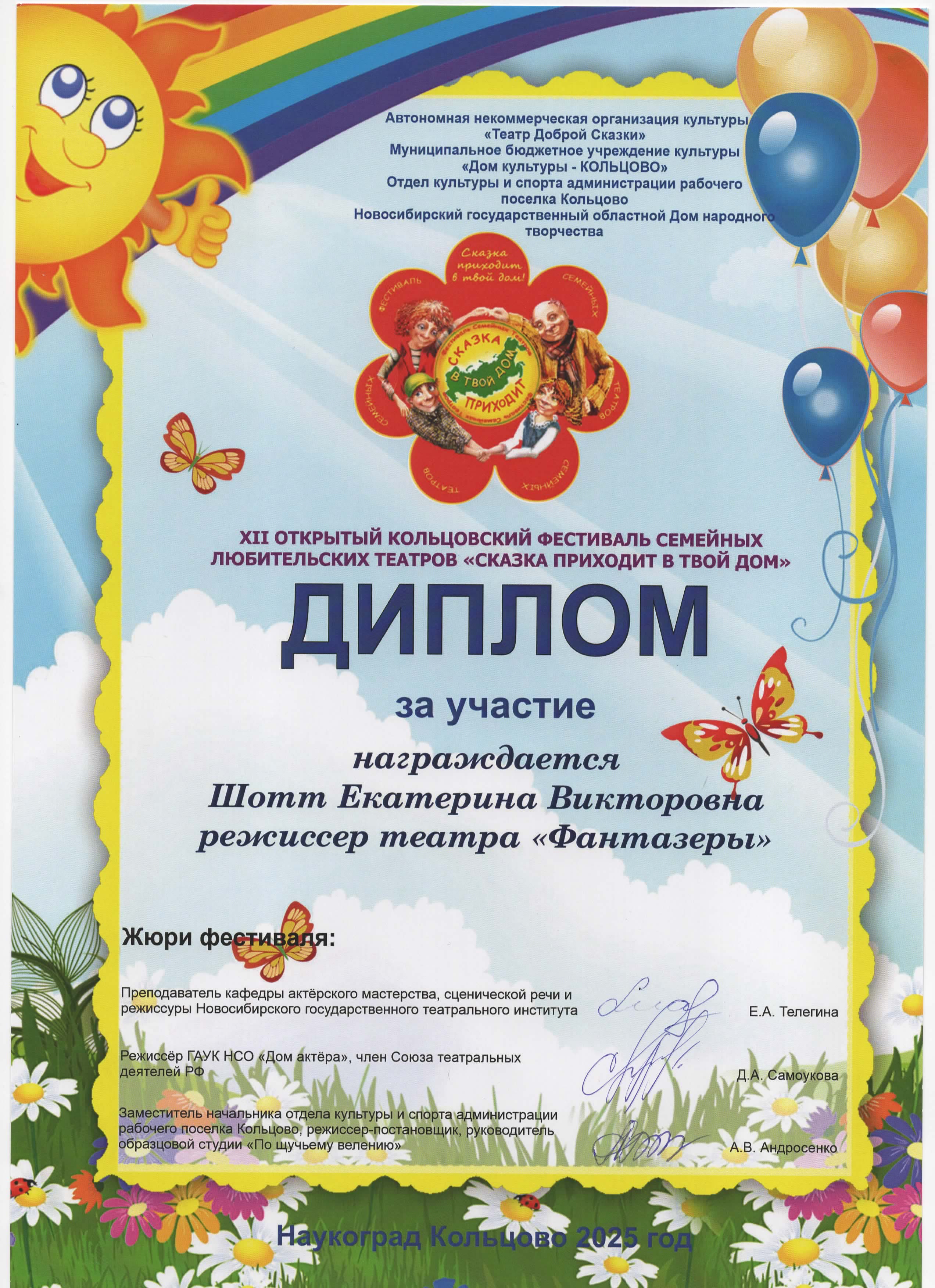 Диплом за участие в XII фестивале семейных любительских театров "Сказка приходит в твой дом" Режиссер театра "Фантазеры"