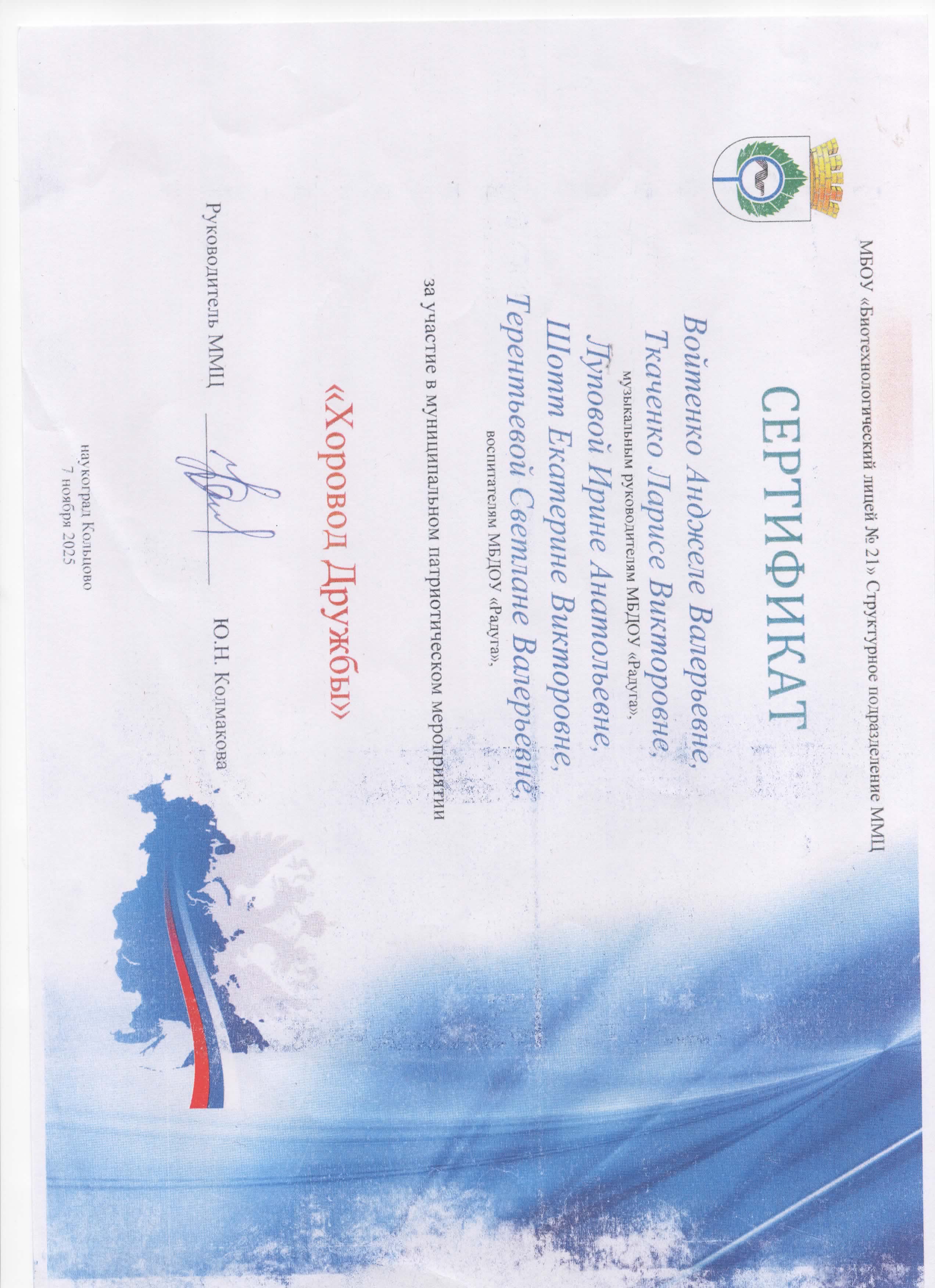Сертификат за участие в муниц. патриотическом мероприятии "Хоровод Дружбы"