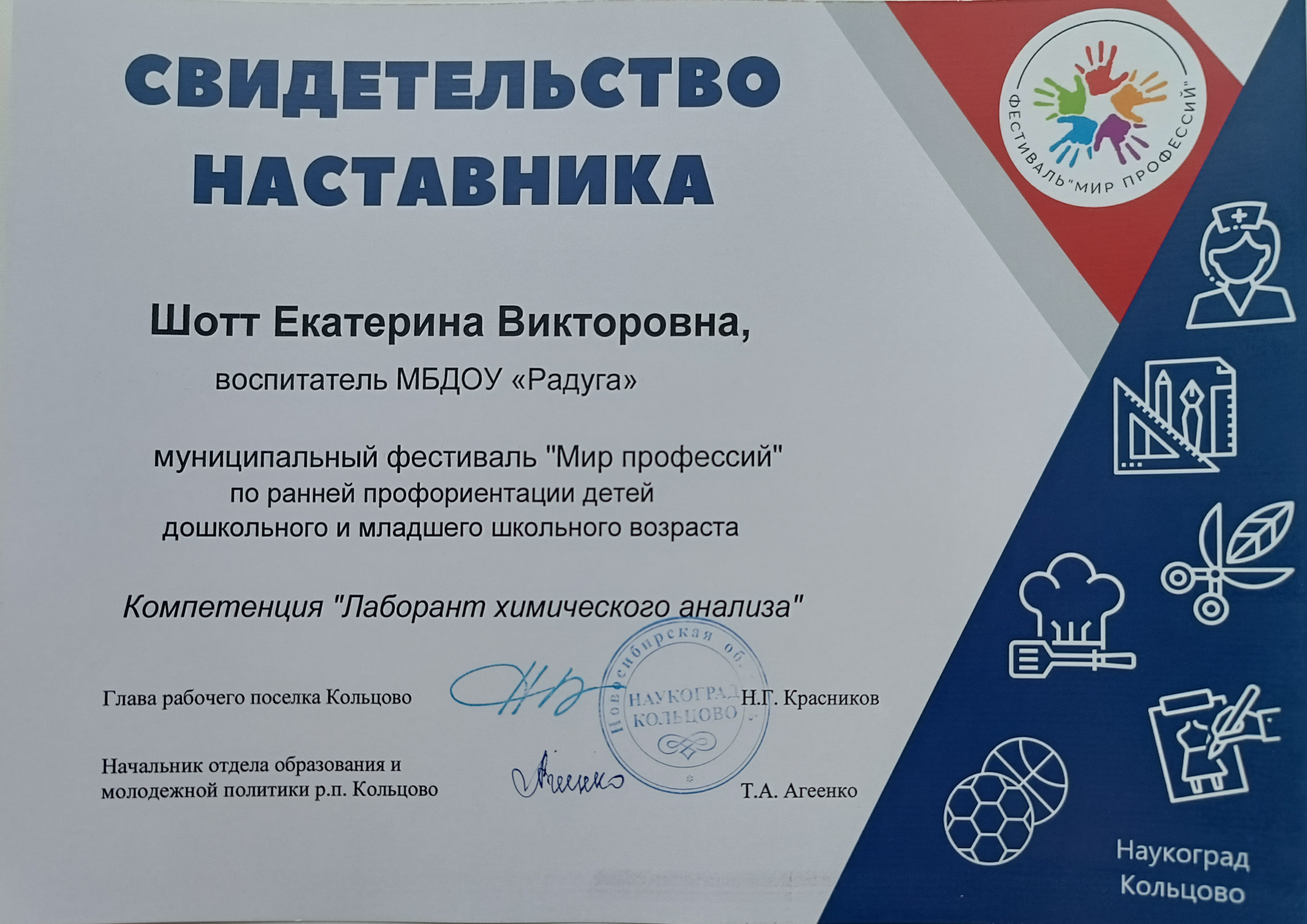 Свидетельство наставника Муниципальный фестиваль "Мир профессий" Компетенция "Лаборант химического анализа "